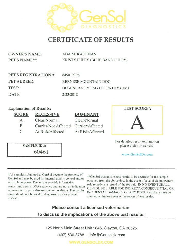Daliah is a delightful mix of our European imported bloodlines, all wrapped up in one sweet, lovable, gorgeous gal! She goes back to our beloved Nitro and Mishka lines and exhibits the characteristics common to both of them; comical, affectionate, brave and structurally correct. She has passed her PennHIPP with flying colors, scoring in the top 95 percentile! She is DM and SODI1 clear, Vwd clear, and OFA elbows normal. We are hoping to get her in the show ring soon! We look forward to her pups sired by our beloved Dozer.
